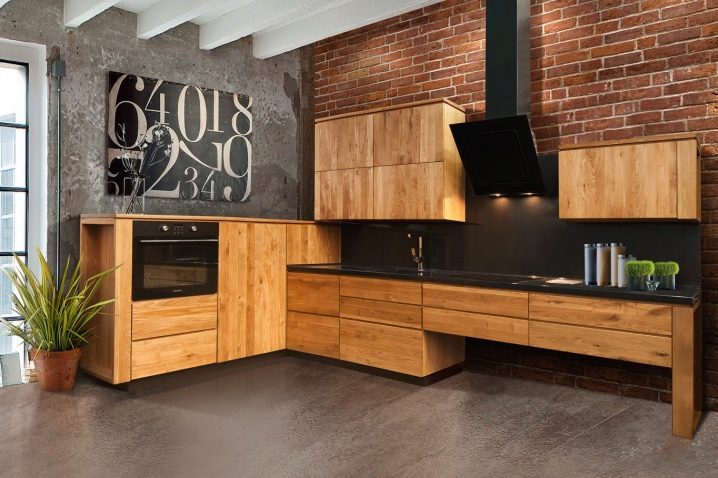 Тъмносивите плочки на пода, в комбинация със същия нюанс на пердетата и плота на комплекта, могат да бъдат оформени с фасада в цвета на необработено дърво. Тухлените стени ще завършат бруталния кухненски дизайн с тъмни подове.