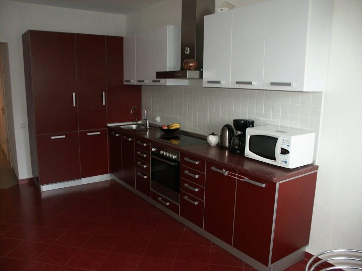 Подът от махагон е подходящ за кухня, която съчетава бордо със слонова кост. Тази комбинация е много подходяща за модерни или високотехнологични интериори..