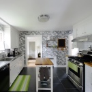 Черно -белият интериор винаги е актуален, включително в кухнята. Ако този интериор е твърде строг за вас, разредете го с декоративен елемент под формата на червено кресло или тюркоазена маса..
