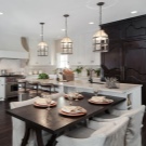Ако сте избрали тъмни подове за кухнята, знайте, че те ще донесат уважение и високи разходи за интериора. Тъмният под винаги изглежда представителен, независимо къде е положен. Интериорът на кухнята с тъмен под изглежда фундаментален и надежден. Това се дължи на факта, че психологически човек по -уверено стои на тъмния под, защото подсъзнанието го свързва със земята.. В допълнение, на тъмен под, всички мебели изглеждат в изгодна светлина, дори обикновените столове или фотьойл се трансформират.