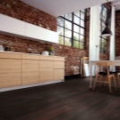 Тухлената зидария е подходяща за тъмен под от плочки, имитиращи естествен камък за декорация на стени. Когато се комбинират, те създават брутален интериор, идеален за голяма кухня..