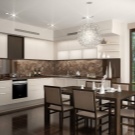 Друго решение е да направите долната част на слушалките в цвета на пода, а горната да контрастирате със светли нюанси на бежово или млечно.. Това ще разсее ситуацията. В същото време изберете столове и маса в цвета на светлата половина на кухнята, тогава тя ще обедини интериора в едно цяло.