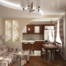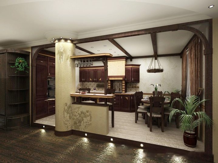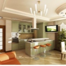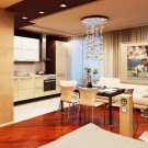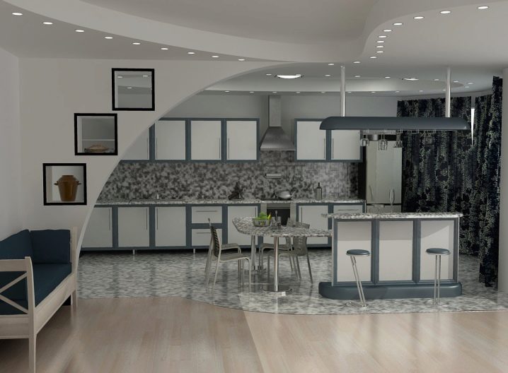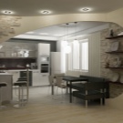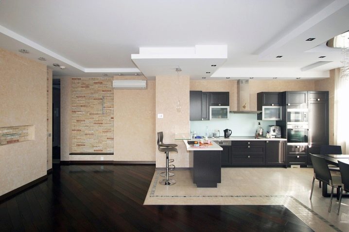 - Различни нива на пространство. Ограничаването на площта на кухнята-студио по нива е добро решение. Има много възможности за такова зониране..