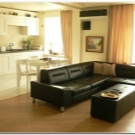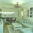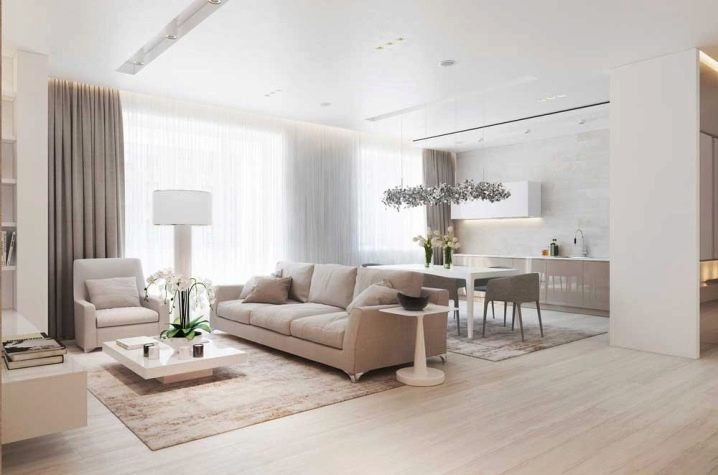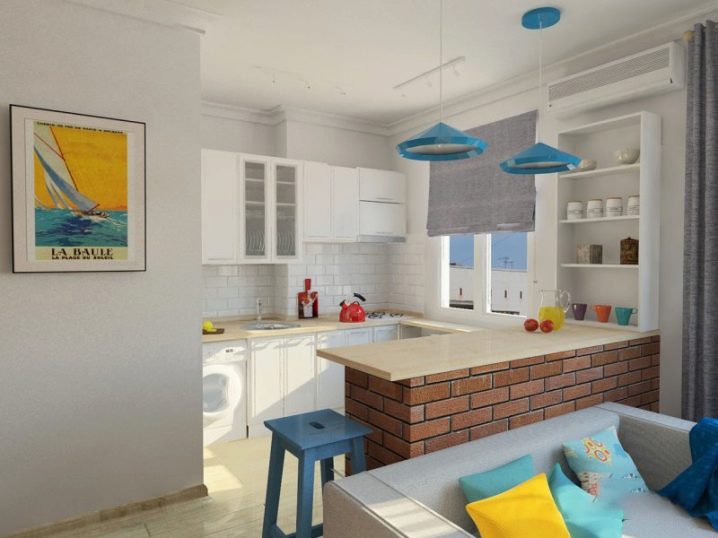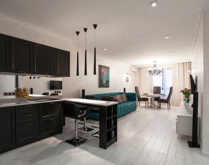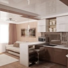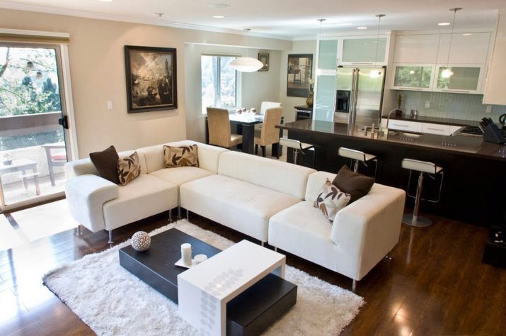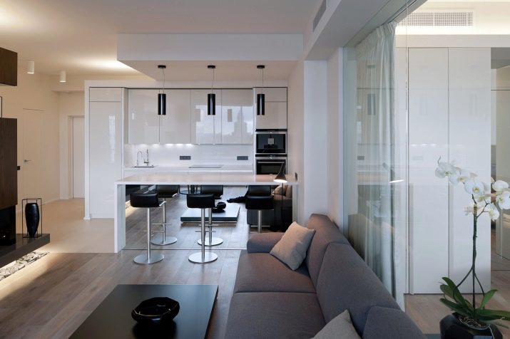 Това оформление увеличава пространството на стаята, не изглежда тесно и неудобно и ви позволява да се движите свободно. Идеален за малки апартаменти, където проектът на хола и кухнята е разделен на твърде малки площи чрез преграда.