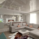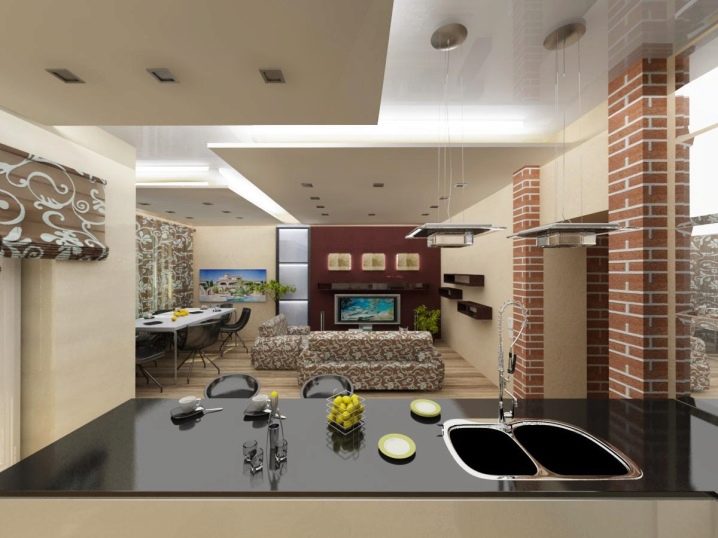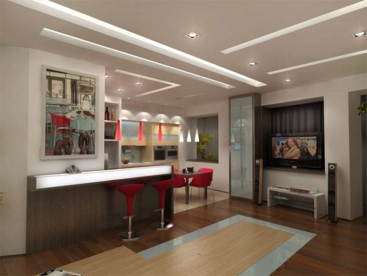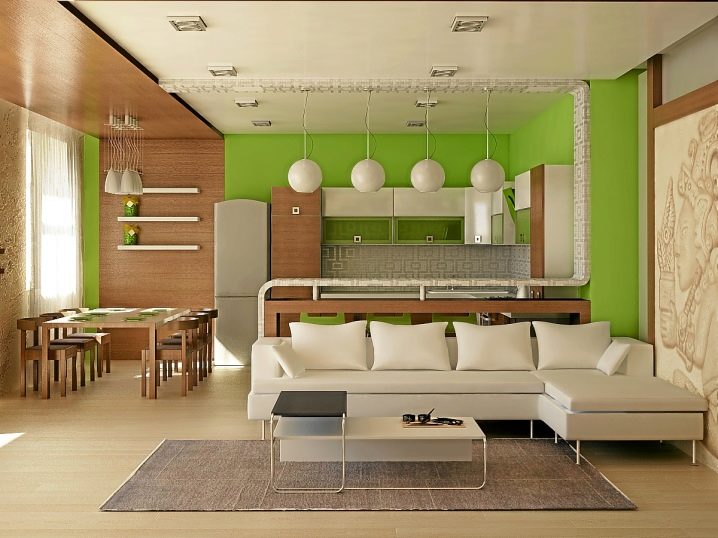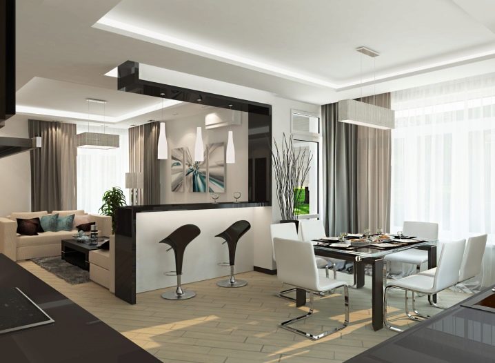 За да е удобно всеки член на семейството да прекарва време у дома, е задължително да се използва зониране. В съвременния дизайн са разработени и приложени много опции: многостепенна стая, зониране с цвят, мебели или плъзгащи се прегради, бар плотове с допълнителни конструкции за плодове и ястия.