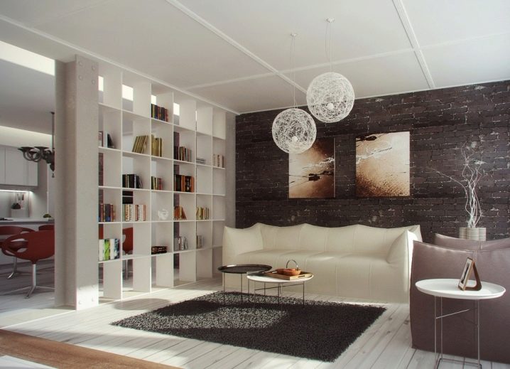 - Простота и минимализъм в мебелния дизайн. Функционалността на интериорните предмети е на първо място. Един прост правоъгълен плот е идеален тук. В дебелината на преградата могат да се поставят хромирани метални лампи.