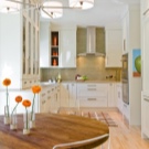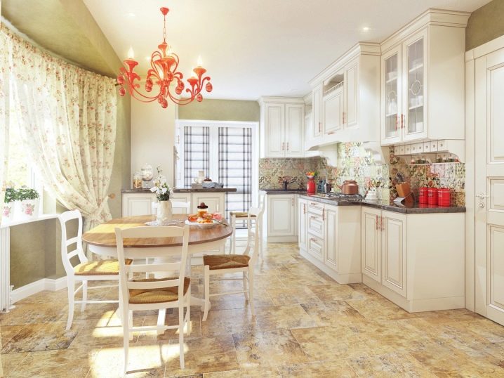 Пространството на кухнята и дневната може да бъде решено в светло бежови или прасковени тонове. Естествените материали ще бъдат голям плюс. Маса от светло дърво, столове с меки седалки на леко извити крака, шкафове, боядисани с пасторални теми. Кухненската престилка може да бъде поставена със светли плочки с билков орнамент или изображение на диви цветя.