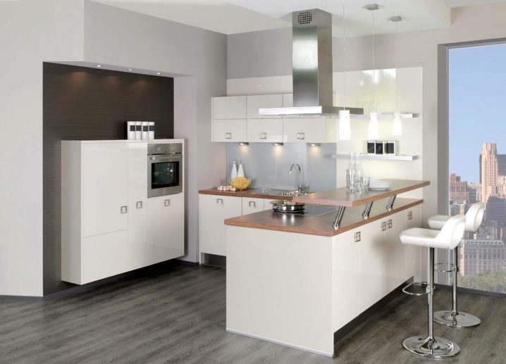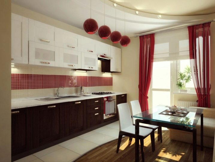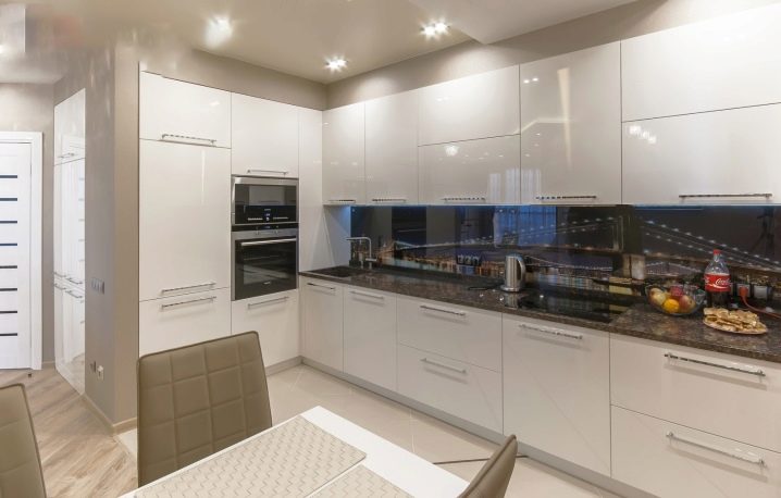 Визуално увеличаване на пространството ще помогне на мини огледала, лъскави мебелни повърхности заедно с опънати тавани с лъскава текстура. Тези повърхности са отлични светлоотразители. Инсталирането на лъскави шкафове от самия таван визуално ще разшири пространството и ще създаде голяма площ за съхранение на кухненски дреболии, съдове, продукти.