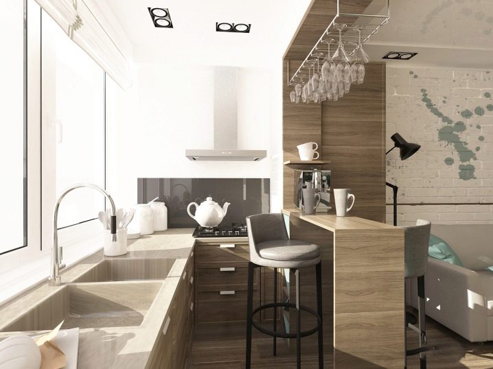 Пространството под бара може да се използва за съхранение на зърнени храни или кухненски прибори. Такъв багажник може да постави мивка и котлон на повърхността. Окачени модули за крехки съдове ще допълнят дизайна. Достатъчно широката повърхност на плота ще замести масата за хранене.
