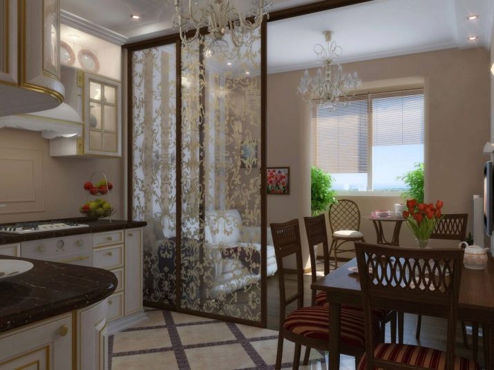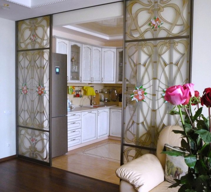 - Плъзгащи се прегради. Най -удобният и практичен вариант ще ви позволи да отделите една зона от другите. Такъв екран може да се използва за отделяне на зоната за спане или кухнята. За да не изглежда тежка структура, можете да изберете опция от леки или полупрозрачни материали: матирано стъкло, опъната тъкан или витражи. Красив модел на стъклото на преградата ще бъде истинска интериорна декорация.
