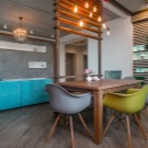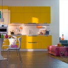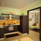 - Цветно зониране. Тази опция може да се комбинира с други решения – подови настилки, стени, тавани, мебели – широко поле за въображение. За основната зона можете да изберете цветова палитра, текстури и материали, които контрастират с останалото пространство. Например кухнята може да бъде направена в сочни жълто-зелени нюанси, а останалото пространство в светли цветове..