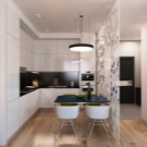 - Дървените мебели трябва да се избягват. Можете да използвате пластмаса, стъкло, хромиран метал. Плотът за маса в преградата може да бъде направен от дебело стъкло или здрава пластмаса. Високите бар столове с метални крака ще го допълнят.