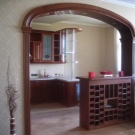 - Прегради, изработени от различни материали. Често се срещат гипсокартонни и дървени прегради. В зависимост от пространството и стила, можете да изберете опции: арка, права или други необичайни форми. Опцията с арка ще ви позволи внимателно да отделите две зони, ако инсталирате прожектори в дебелината на конструкцията.