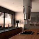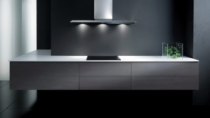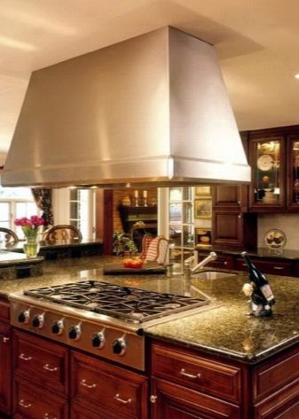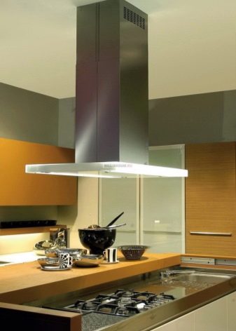 - Островни качулки това са тези, които са фиксирани към тавана, а не към стената. Те могат да бъдат инсталирани навсякъде в стаята и често се използват в кухни, където работната повърхност и плота са разположени в средата на стаята. Изходът на въздух на такъв абсорбатор е вертикален, но предполага възможността за източване на тръбата по тавана във вентилация..