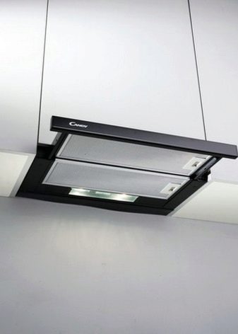- Шарнирните абсорбатори не се отнасят за абсорбаторите с куполи.. Това са модели, които имат въглеродни филтри и са монтирани под обикновен шкаф. Те включват наклонени качулки, които са прикрепени към стената, но имат повърхност, разположена под остър ъгъл. Характеристиките показват, че такива абсорбатори имат ниво на шум под 40 dB, но тогава възниква въпросът за тяхната ефективност. В крайна сметка, ако панелът с филтри не е разположен над плота, тогава мощността на всмуквания въздух трябва да бъде по -висока, следователно нивото на шума е по -високо.