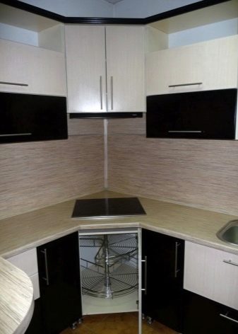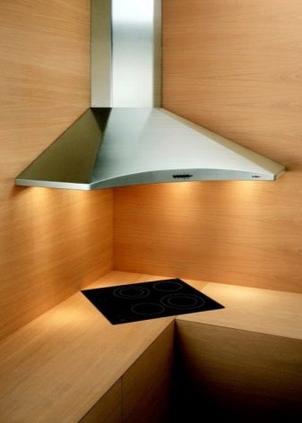 - Ъглови абсорбатори за тези котлони, които се намират в ъгъла на стаята. В допълнение към интересния си външен вид, те имат и друго предимство, по -лесно се интегрират в мебелите. Тези абсорбатори се различават от камините само по своето местоположение, имат и корпус, вграден във вентилацията и могат да работят в режим на филтрация на въздух.