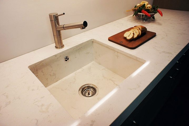 Що се отнася до мивките, монтирани в плота, те със сигурност изглеждат много хубави и органични. Но поради трудността при обработката на посочения материал, съществуват редица ограничения за тяхното производство. Така например, готовите плочи от кварц на практика не се правят на повече от 300 см. Ето защо експертите съветват да се даде предпочитание на отделни вградени мивки, а не на вградени. Това улеснява ремонта и е по -евтино да се сменя..