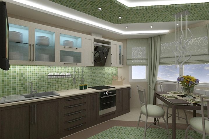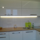 - LED прожектори с квадратна форма, разположени по периметъра на кухнята в окачения таван;