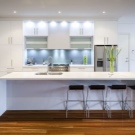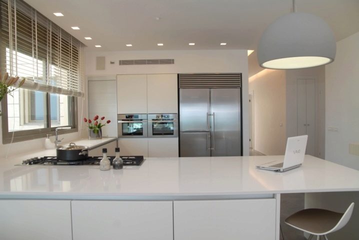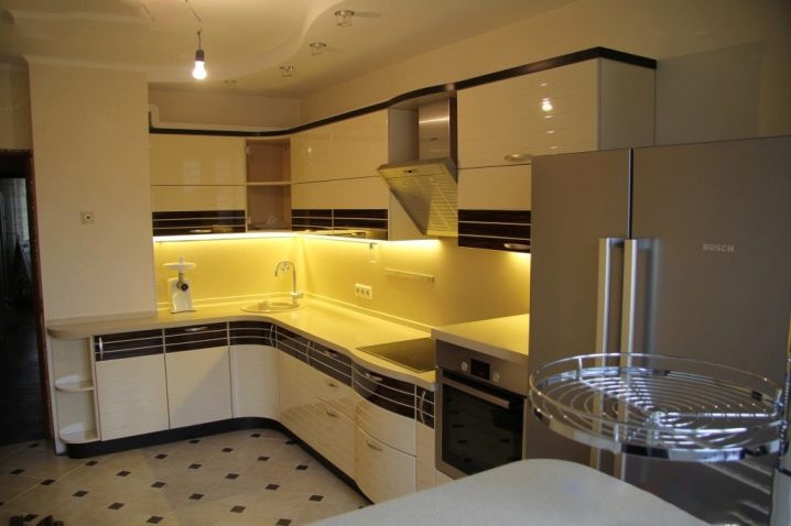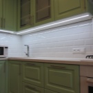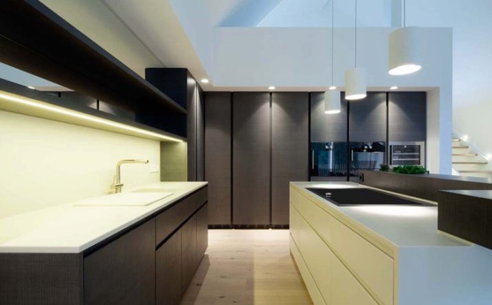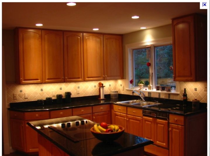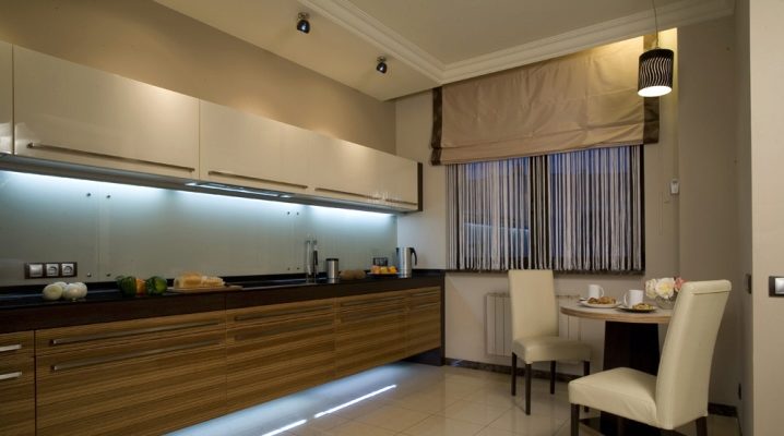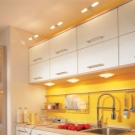 Необходимо е да се разработи проект и да се инсталират прожектори в кухнята заедно с ремонта, за да се вземат предвид всички функции предварително и удобно да се скрият проводниците, сенниците и разпределителните табла под интериорните детайли.
