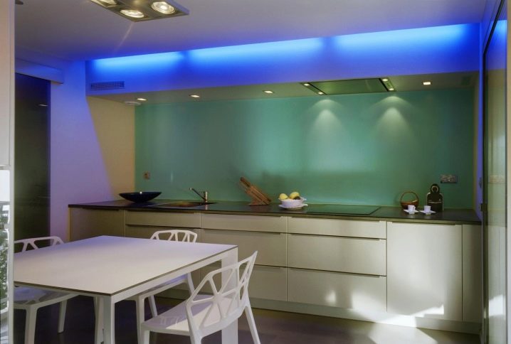 Флуоресцентните лампи за кухнята могат да бъдат както таванни, така и прожектори. Тяхната отличителна черта е, че в зависимост от пълнежа с различен състав на газ, те излъчват различни нюанси светлина: синкаво, чисто бяло, бяло с жълт или лилав оттенък. Следователно има няколко цветови варианта за дизайна..