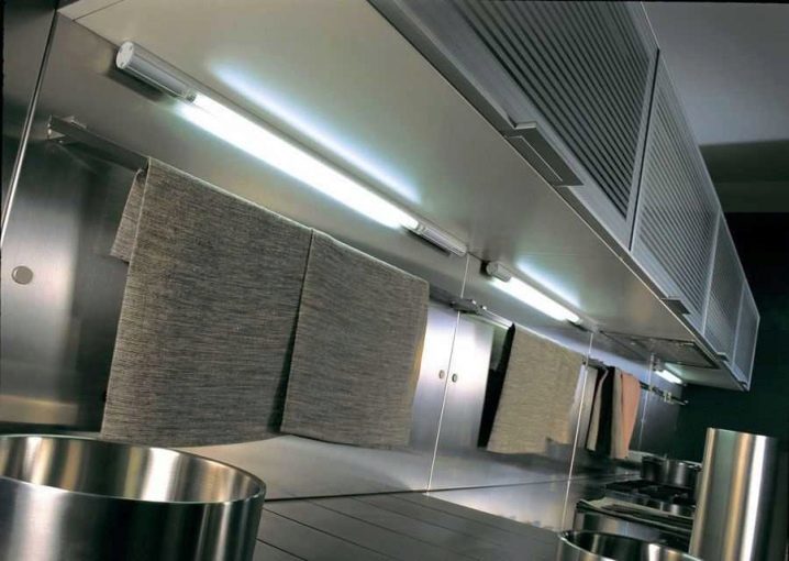 Флуоресцентни лампи съдържат инертни газове с живачни пари вътре, когато са свързани към източник на ток, вътре се създава дъгов разряд, образувайки ултравиолетово сияние – това е източникът на светлина. Такива сортове обикновено се правят под формата на тръби с различна дължина и дебелина, но има опции в кръгла кутия, които се завинтват в съответния нюанс. Характерна особеност на флуоресцентните лампи е студено бяло сияние с висока интензивност, така че такива модели са в състояние ефективно да осветяват всеки ъгъл на кухнята..