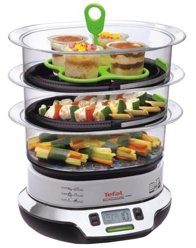 По -скъпият модел Tefal VC300830 е не по -малко популярен. Тя има три нива с прозрачни купи, контейнер за готвене на ориз и яйца. Резервоарът за вода има капацитет от един и половина литра и можете да добавите вода по време на готвене. Устройството има режими за печене, размразяване и поддържане на температурата. Цена – около 8,4 хиляди рубли.