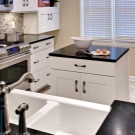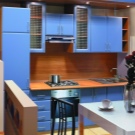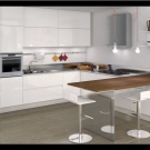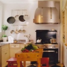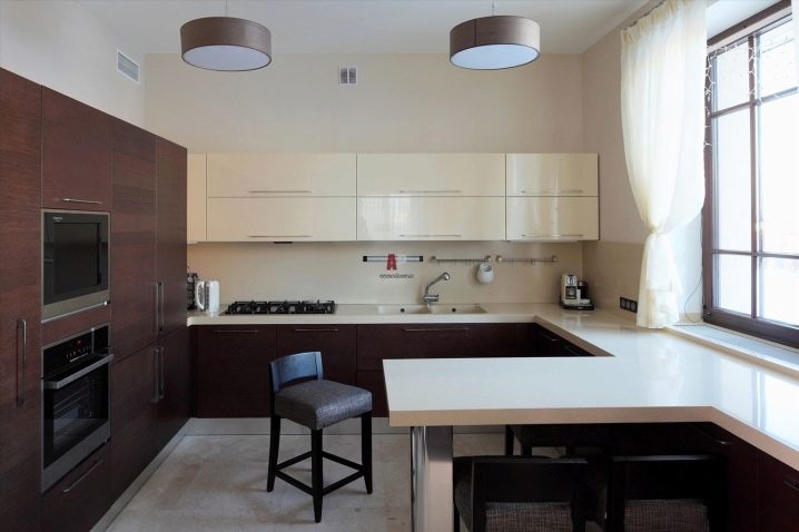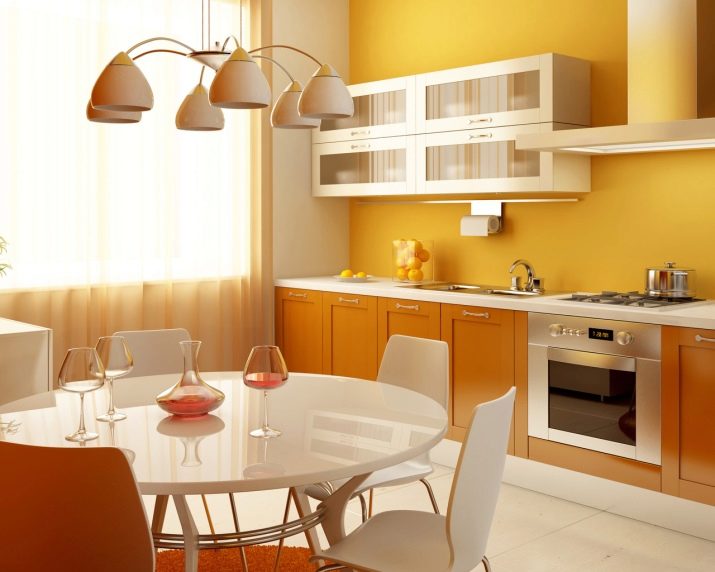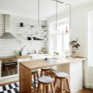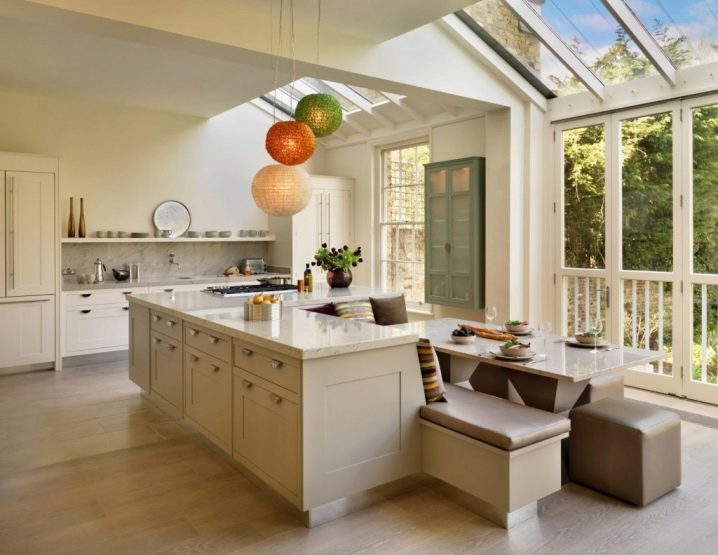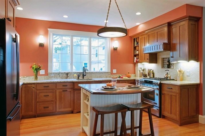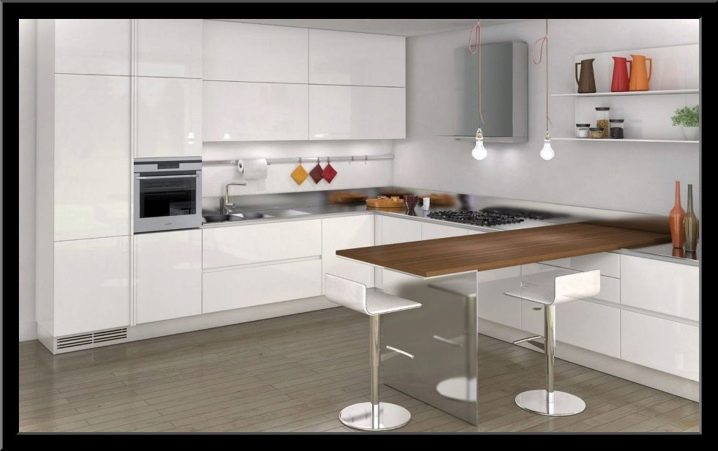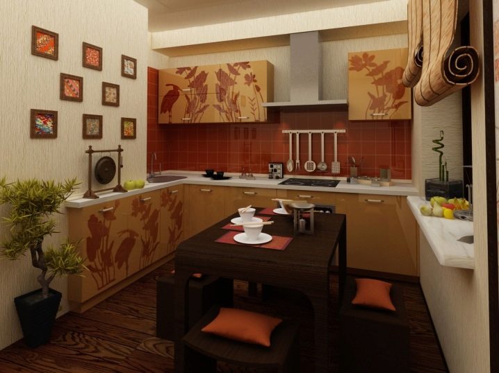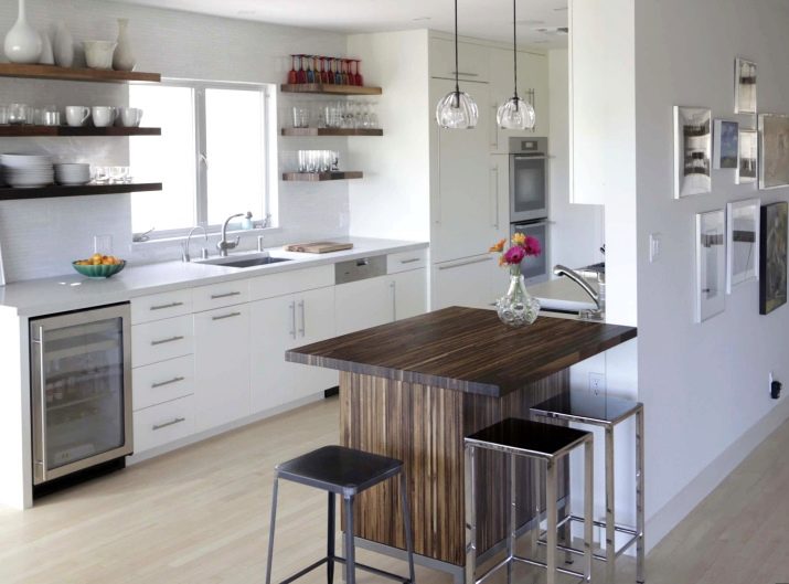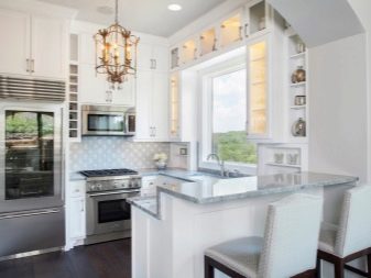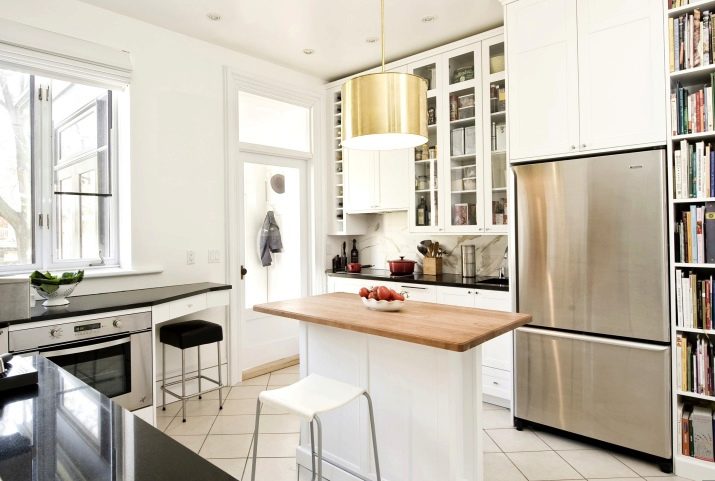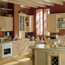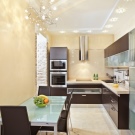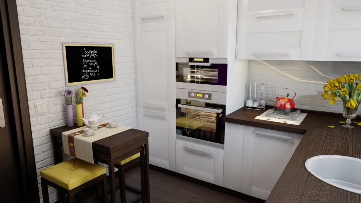 Допълнителна маса. В центъра на кухнята има малка маса с няколко стола и ъглова маса на двете съседни стени. Това може да бъде място за съхранение, декоративна зона и дори кабинет, ако е необходимо..