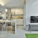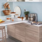 Удълженият бар брояч, който има подход от двете страни и вградени функционални рафтове, може да побере петима души. Друг плюс е, че може да служи и като работна повърхност по време на готвене..