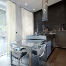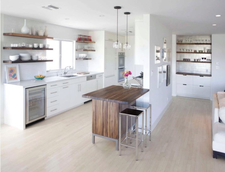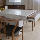 Друг вариант е да направите масата напълно използваща дължината на стената от едната страна на кухнята. По правило такава маса е разделена на зони – място за маса за хранене и място за съхранение на кухненски атрибути..