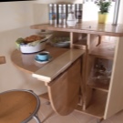 Такива модели на маса сега се считат за много модерни. В тесното пространство на малка кухня такова решение ще бъде много правилно, защото за сметка на ъглова маса ще освободите ценно свободно пространство..