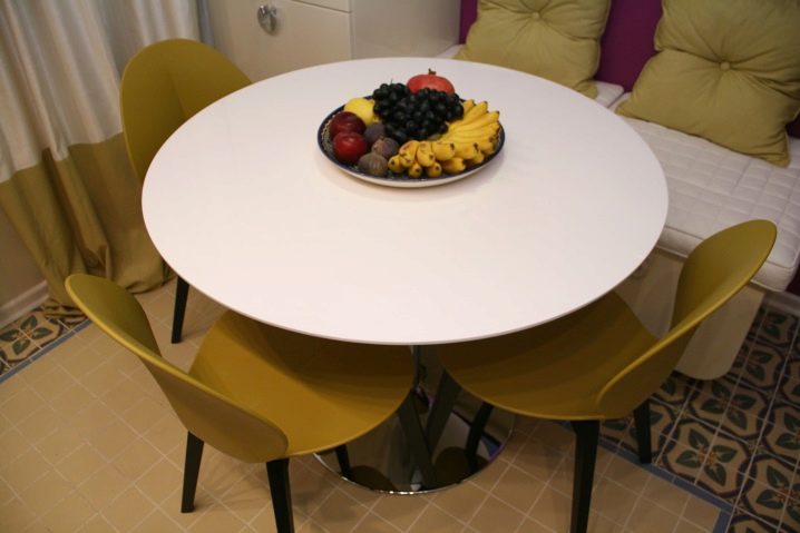 Кръглата кухненска маса изглежда лека и компактна, създава уютна атмосфера в кухнята, ухае на домашна топлина и такава маса ще се впише във всеки интериор. Но ако стаята е направена в строги геометрични пропорции, не можете да прикрепите такъв модел там..