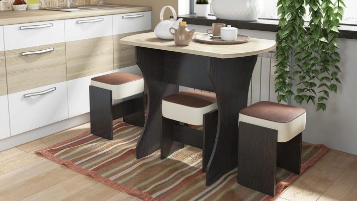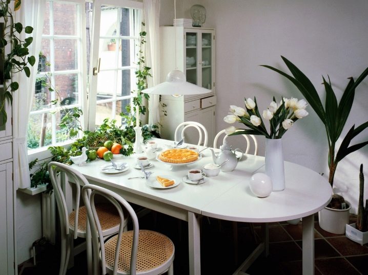 Нека в семейството ви има петима души, но не можете да се храните заедно, тогава добре – двама ще бъдат настанени на такава маса. И ако сте любители на съвместни семейни събирания, тогава е по -добре да подредите маса за хранене в хола и оставете малката да остане в кухнята – няма да навреди.