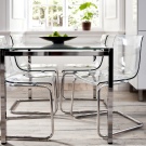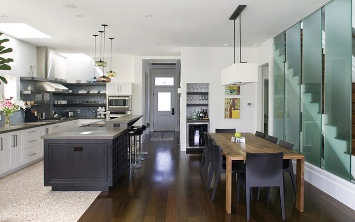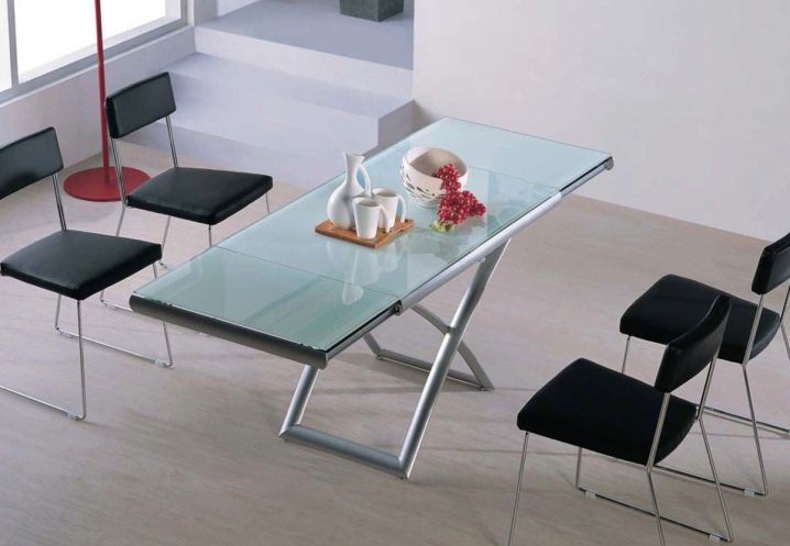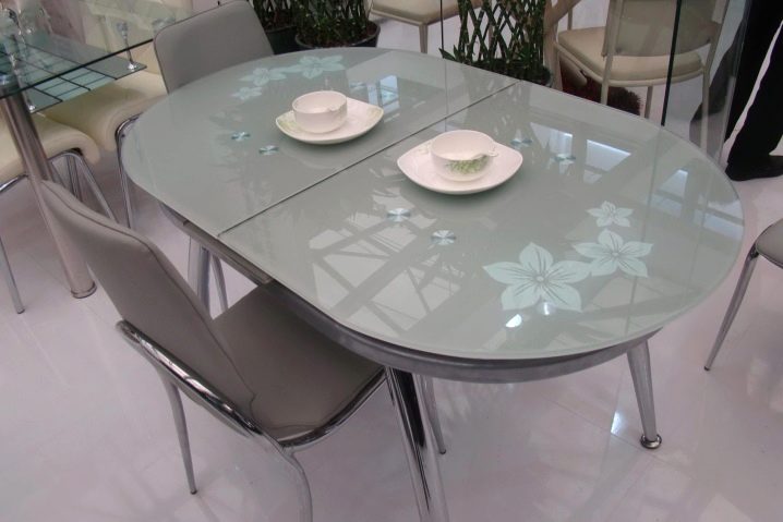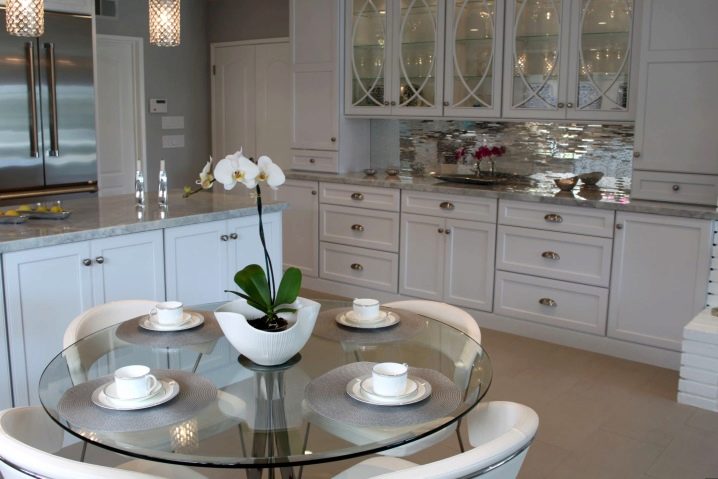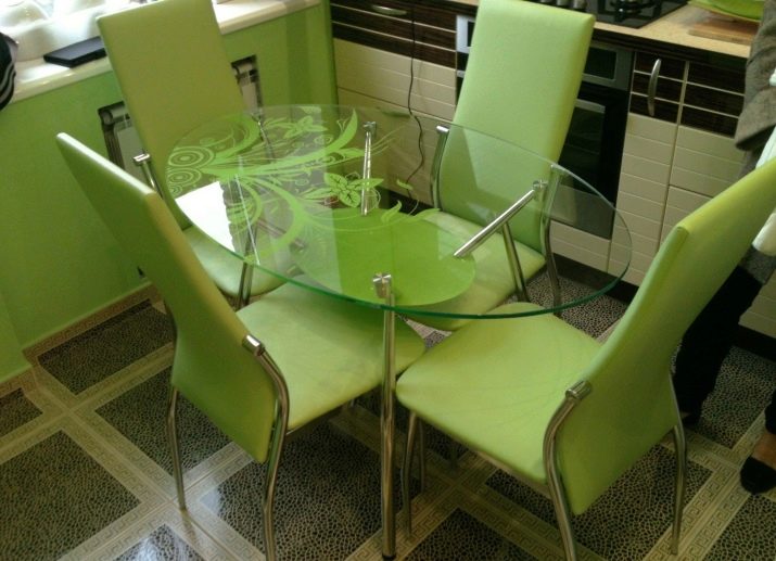 Ако сте избрали оригинална стъклена маса, това ще придаде на вашата кухня визуална ефирност и ще я направи по -просторна. И ако прозрачният дизайн постоянно ви вдъхновява от страх от крехкостта си, изберете по -добре матирано стъкло..