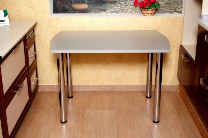 Странични маси. Такива модели са прикрепени към нещо от едната страна (задължително дори), а от другата страна имат два крака. Свободната страна може да бъде с всякаква форма, но най -често срещаният вариант е полукръг. Те могат да служат като удобна работна повърхност в кухнята, можете да поставите ваза с цветя на масата.