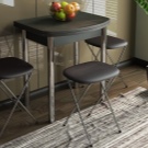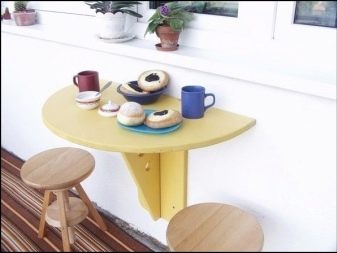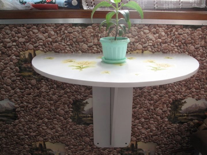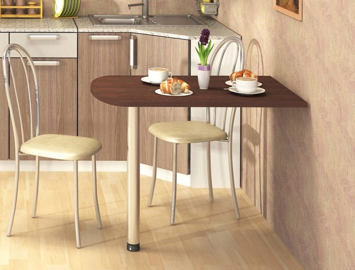 Друга версия на компактна маса има формата на сгъваем плот (понякога квадратен, но по -често полукръгъл), който е окачен на стената. Когато е необходимо, плотът се повдига и фиксира на една опора за крака, след което всичко се отстранява и отново няма проблеми с придвижването из кухнята.
