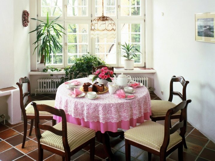 Покривката ще направи лека малка маса нещо обемно и затова е по -добре да я откажете и като алтернатива можете да използвате ажурна салфетка в центъра на масата.