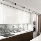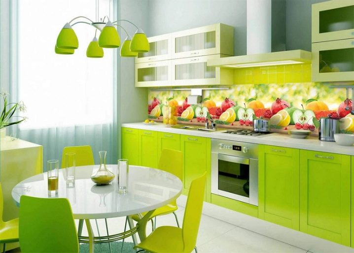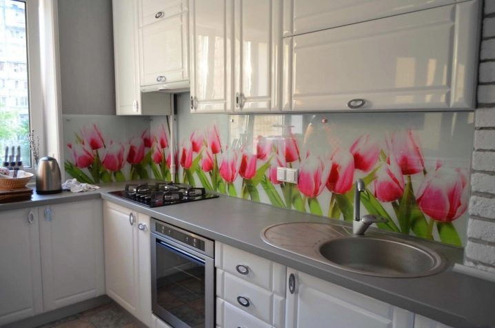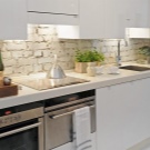 Ако основният акцент на вашата кухня са слушалки, тогава неутралната престилка, изработена от материали с дискретна текстура, е по -подходяща за нея. И ако искате да украсите кухнята с ефектна стена, поръчайте прозрачен стъклен панел с контрастен печат на снимки.