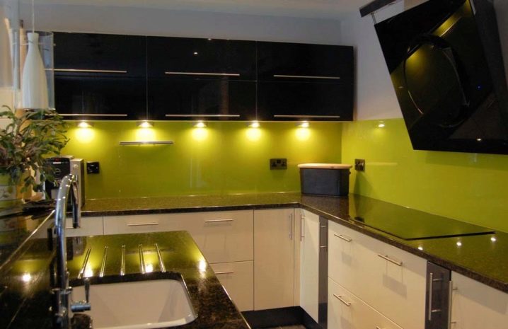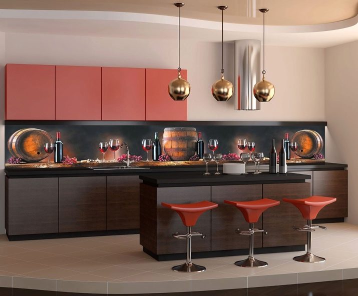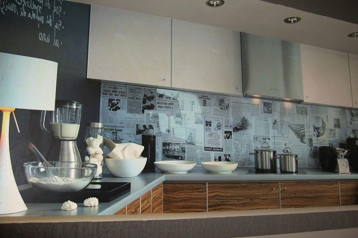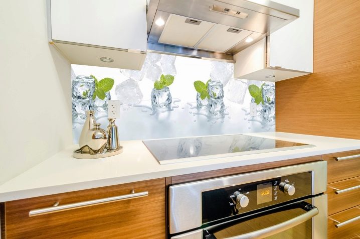 Е, важните характеристики на кухненския защитен екран се считат за трайността на покритието, трайността и хигиената, както и богат избор от материали, от които може да бъде направен: от само боядисана или облицована с плочки стена до медна или стъклен лист по цялата дължина на работната повърхност..