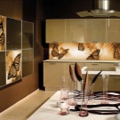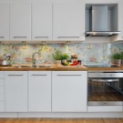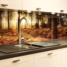 Стъклото за кухненска престилка не се използва толкова често, колкото плочките, но има богато разнообразие от текстури и цветове. Всяко фотографско изображение може да бъде поставено зад стъкления панел на защитния екран, което ще стане един вид "черешата на тортата" при създаване на уникален интериор.