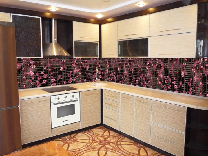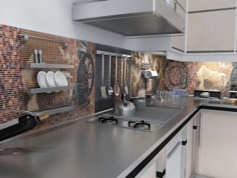 Мозайката е по -скъп материал за защитна престилка от плочките, но и по -променлив. Позволява ви да създавате сложни орнаменти и дори цели снимки върху кухненската стена от малки различни парчета плочки.