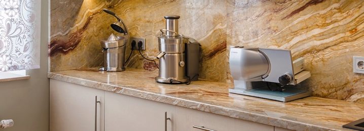 Естественият камък за кухненски облицовки е скъпо удоволствие, което изисква специални грижи, подходящ интериор и, разбира се, работни повърхности и плотове, също от камък. Най -често мраморната престилка се среща в кухненския дизайн, въпреки че напоследък дизайнерите все повече използват други видове естествен камък (оникс, гранит, базалт).
