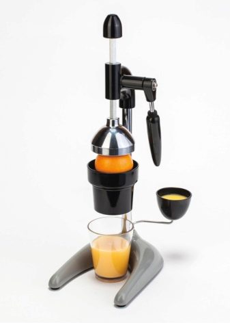 Механичният модел на притискането на пресата има лост, който е прикрепен към леглото. Половината от плодовете се поставят между две шишарки. С помощта на лоста се активира пресата и започва да изстисква плодовете, сокът влиза в купата през отворите в долния конус. Получавате сок без много усилия.