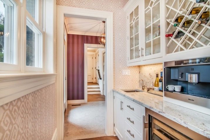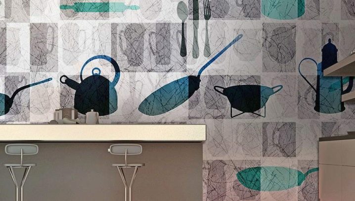 - Има много специални „кухненски“ дизайни за миещи се тапети – има тапети с храна, напитки, плодове и зеленчуци, както и чайници, чаши, лъжици и вилици. Можете да изберете такъв цвят за тапети, ако кухнята ви не е декорирана в някакъв специален стил, а е просто място за готвене и декорации за нея са държачи, закачени по стените, комплекти тигани или ярки халби и чинии;