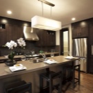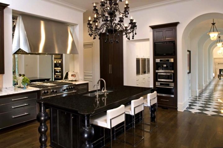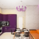 Лампите с тъмни нюанси, стъклени или пластмасови, са отлично решение за създаване на кухня в контрастен стил. Тъмният полилей изглежда страхотно на фона на светли лъскави слушалки. Такъв елемент на изкуствено осветление е в състояние да изпълни всеки интериор с тържественост и да добави изключителен лукс към него..