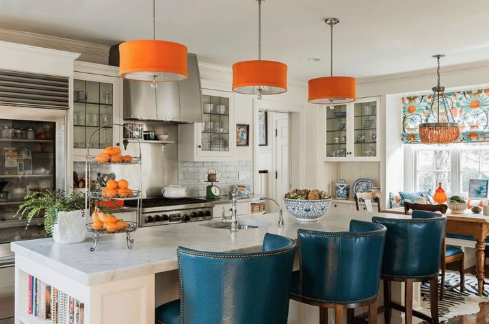 Ярко проектиран полилей е създаден специално за тези собственици, които искат кухнята им да има ярки закачливи елементи. Ярко синя, тюркоазена, зелена или розова лампа ще изглежда страхотно на фона на дискретни мебели или заедно с други ярки детайли.