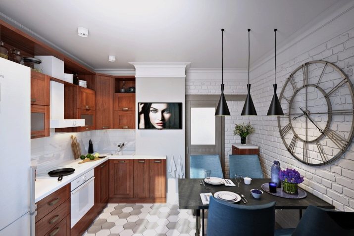 Въпреки умалителността си, кухнята все още се нуждае от висококачествено осветление. Таванният полилей с кръгла или диамантена форма работи добре за кухни. За сянката на такива полилеи най -често се използва тъпо стъкло..