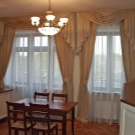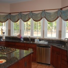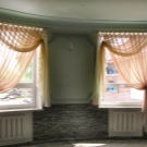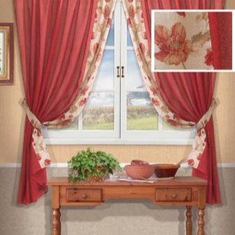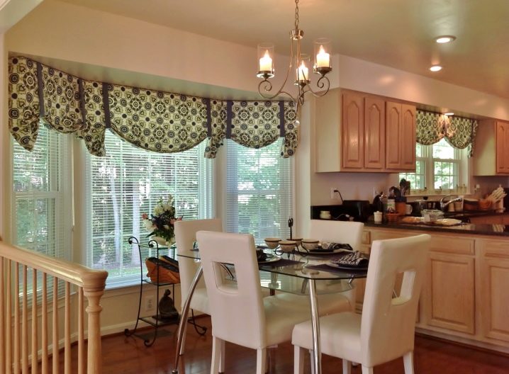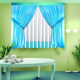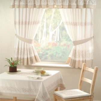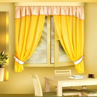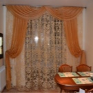 Ако трябва да правите разлика между зоната, където се приготвя храна и зоната за отдих, в апартаменти с комбинирана кухня и хол, е необходимо да подчертаете разликата между тези две стаи с помощта на текстил на прозорците. За да направите това, на прозорците в хола можете да поставите богати завеси с ламбрекени, волани, а в кухнята можете да поставите непретенциозни завеси с непретенциозен дизайн. Можете да комбинирате тези прозорци, като поставите ламбрекин от твърда тъкан върху втория, който се използва за украса на първия прозорец..