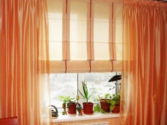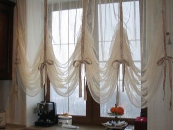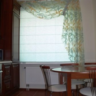 В кухнята е позволено да украсите прозореца само с един тюл или да го комбинирате с една или повече дебели завеси..