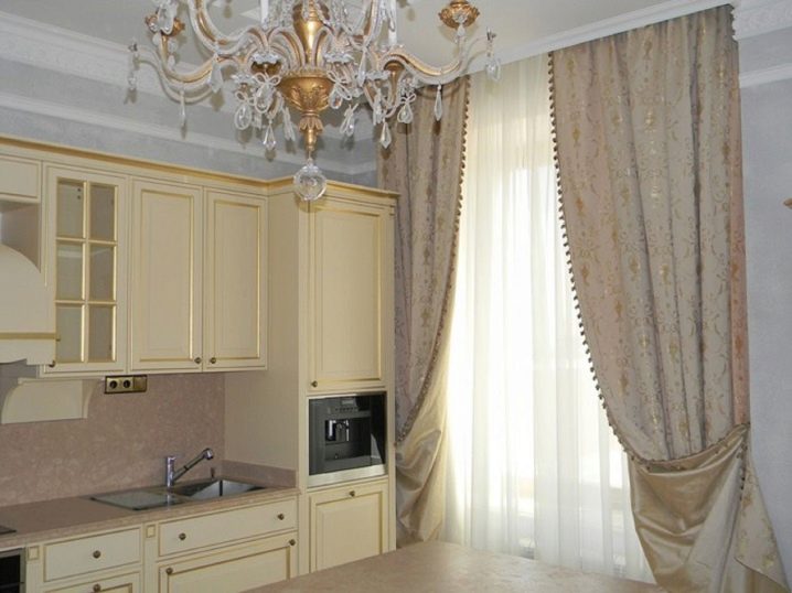 Дългите завеси до пода ще украсят всяка кухня. В един слой или в няколко, те ще подчертаят всеки интериор, ще го направят по -лаконичен. Можете да завесите тези завеси по напълно различни начини. Позволено е да го хвърлите върху завесата, да го разпънете в различни посоки от прозореца или да го закачите само от едната страна. Може да се остави без драперия, да виси свободно. Но те трябва да се използват само ако стената с прозореца не е покрита с нищо..