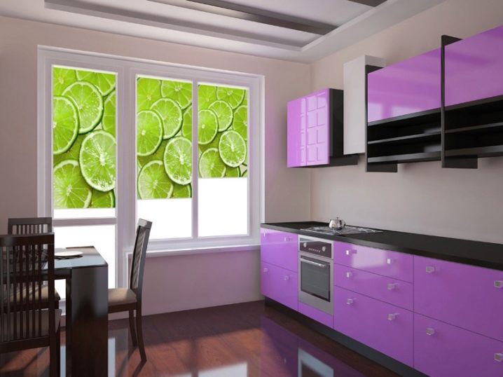 Яркото, богато лилаво също е в тенденция. Кухня, направена в този цвят, ще донесе радост, тя върви добре със светли нюанси.
